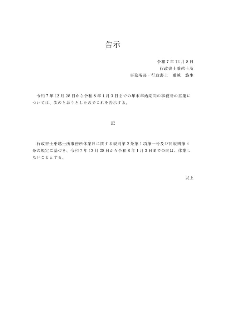 行政書士乗越士所の年末年始の営業については下記のとおりとなります。