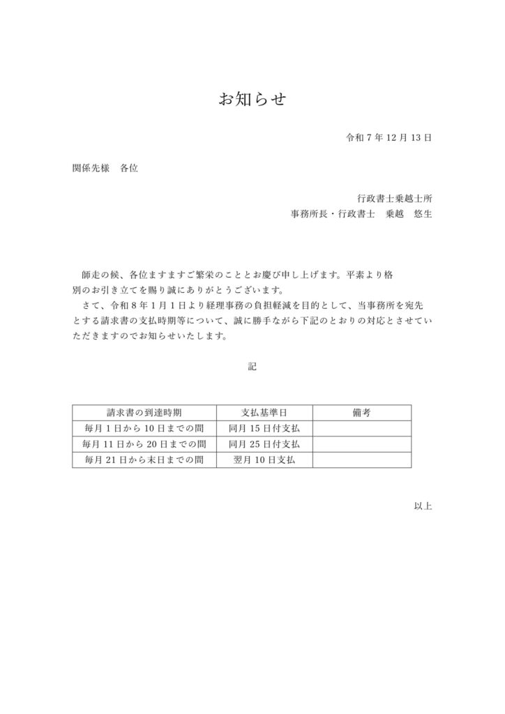 令和8年1月1日より、当事務所を宛先とする請求書の支払時期について、経理処理の負担の軽減の観点から、誠に勝手ながら次のとおりとさせていただきます。